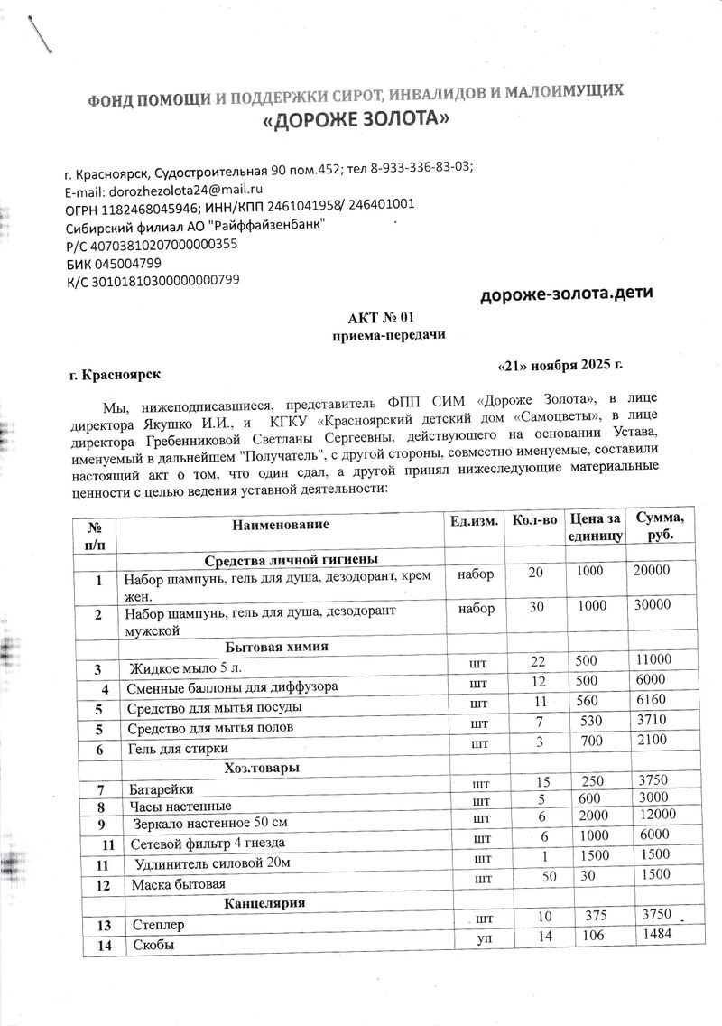 Который был направлен на помощь в восполнении необходимых товаров для детей без попечения родителей "КГКУ Детский дом Самоцветы".